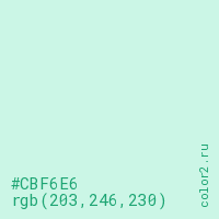Цвет #CBF6E6 в цветовой модели RGB обозначается тремя октетами (203, 246, 230) в десятичном формате и #CBF6E6 в шестнадцатиричном (hex) формате, которые являются интенсивностью красного 203 (hex CB), интенсивность зелёного 246 (hex F6) и интенсивность синего 230 (hex E6).