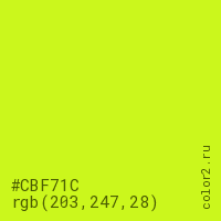 Цвет #CBF71C в цветовой модели RGB обозначается тремя октетами (203, 247, 28) в десятичном формате и #CBF71C в шестнадцатиричном (hex) формате, которые являются интенсивностью красного 203 (hex CB), интенсивность зелёного 247 (hex F7) и интенсивность синего 28 (hex 1C).