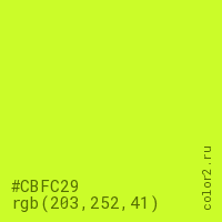 Цвет #CBFC29 в цветовой модели RGB обозначается тремя октетами (203, 252, 41) в десятичном формате и #CBFC29 в шестнадцатиричном (hex) формате, которые являются интенсивностью красного 203 (hex CB), интенсивность зелёного 252 (hex FC) и интенсивность синего 41 (hex 29).