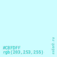 Цвет #CBFDFF в цветовой модели RGB обозначается тремя октетами (203, 253, 255) в десятичном формате и #CBFDFF в шестнадцатиричном (hex) формате, которые являются интенсивностью красного 203 (hex CB), интенсивность зелёного 253 (hex FD) и интенсивность синего 255 (hex FF).