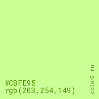 Цвет #CBFE95 в цветовой модели RGB обозначается тремя октетами (203, 254, 149) в десятичном формате и #CBFE95 в шестнадцатиричном (hex) формате, которые являются интенсивностью красного 203 (hex CB), интенсивность зелёного 254 (hex FE) и интенсивность синего 149 (hex 95).