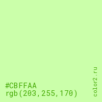 Цвет #CBFFAA в цветовой модели RGB обозначается тремя октетами (203, 255, 170) в десятичном формате и #CBFFAA в шестнадцатиричном (hex) формате, которые являются интенсивностью красного 203 (hex CB), интенсивность зелёного 255 (hex FF) и интенсивность синего 170 (hex AA).