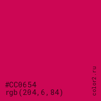 Цвет #CC0654 в цветовой модели RGB обозначается тремя октетами (204, 6, 84) в десятичном формате и #CC0654 в шестнадцатиричном (hex) формате, которые являются интенсивностью красного 204 (hex CC), интенсивность зелёного 6 (hex 06) и интенсивность синего 84 (hex 54).