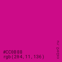 Цвет #CC0B88 в цветовой модели RGB обозначается тремя октетами (204, 11, 136) в десятичном формате и #CC0B88 в шестнадцатиричном (hex) формате, которые являются интенсивностью красного 204 (hex CC), интенсивность зелёного 11 (hex 0B) и интенсивность синего 136 (hex 88).