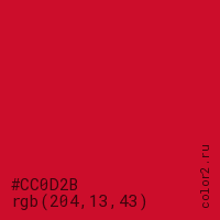 Цвет #CC0D2B в цветовой модели RGB обозначается тремя октетами (204, 13, 43) в десятичном формате и #CC0D2B в шестнадцатиричном (hex) формате, которые являются интенсивностью красного 204 (hex CC), интенсивность зелёного 13 (hex 0D) и интенсивность синего 43 (hex 2B).