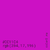 Цвет #CC11C4 в цветовой модели RGB обозначается тремя октетами (204, 17, 196) в десятичном формате и #CC11C4 в шестнадцатиричном (hex) формате, которые являются интенсивностью красного 204 (hex CC), интенсивность зелёного 17 (hex 11) и интенсивность синего 196 (hex C4).