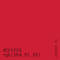 Цвет #CC1F35 в цветовой модели RGB обозначается тремя октетами (204, 31, 53) в десятичном формате и #CC1F35 в шестнадцатиричном (hex) формате, которые являются интенсивностью красного 204 (hex CC), интенсивность зелёного 31 (hex 1F) и интенсивность синего 53 (hex 35).