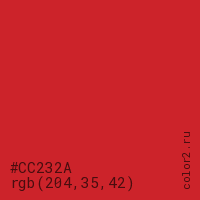 Цвет RGB(204, 35, 42) в процентом отношении количества цвета состоит из 80% красного (red), 13.7% зелёного (green) и 16.5% синего (blue).