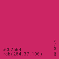 Цвет #CC2564 в цветовой модели RGB обозначается тремя октетами (204, 37, 100) в десятичном формате и #CC2564 в шестнадцатиричном (hex) формате, которые являются интенсивностью красного 204 (hex CC), интенсивность зелёного 37 (hex 25) и интенсивность синего 100 (hex 64).