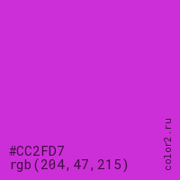 Цвет #CC2FD7 в цветовой модели RGB обозначается тремя октетами (204, 47, 215) в десятичном формате и #CC2FD7 в шестнадцатиричном (hex) формате, которые являются интенсивностью красного 204 (hex CC), интенсивность зелёного 47 (hex 2F) и интенсивность синего 215 (hex D7).