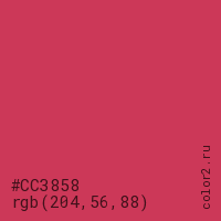 Цвет #CC3858 в цветовой модели RGB обозначается тремя октетами (204, 56, 88) в десятичном формате и #CC3858 в шестнадцатиричном (hex) формате, которые являются интенсивностью красного 204 (hex CC), интенсивность зелёного 56 (hex 38) и интенсивность синего 88 (hex 58).