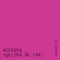Цвет #CC3894 в цветовой модели RGB обозначается тремя октетами (204, 56, 148) в десятичном формате и #CC3894 в шестнадцатиричном (hex) формате, которые являются интенсивностью красного 204 (hex CC), интенсивность зелёного 56 (hex 38) и интенсивность синего 148 (hex 94).