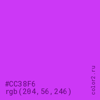Цвет #CC38F6 в цветовой модели RGB обозначается тремя октетами (204, 56, 246) в десятичном формате и #CC38F6 в шестнадцатиричном (hex) формате, которые являются интенсивностью красного 204 (hex CC), интенсивность зелёного 56 (hex 38) и интенсивность синего 246 (hex F6).