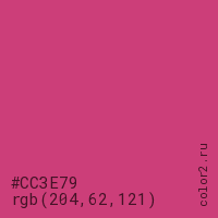 Цвет #CC3E79 в цветовой модели RGB обозначается тремя октетами (204, 62, 121) в десятичном формате и #CC3E79 в шестнадцатиричном (hex) формате, которые являются интенсивностью красного 204 (hex CC), интенсивность зелёного 62 (hex 3E) и интенсивность синего 121 (hex 79).