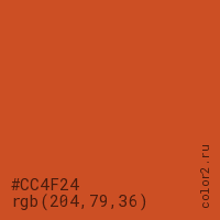 Цвет #CC4F24 в цветовой модели RGB обозначается тремя октетами (204, 79, 36) в десятичном формате и #CC4F24 в шестнадцатиричном (hex) формате, которые являются интенсивностью красного 204 (hex CC), интенсивность зелёного 79 (hex 4F) и интенсивность синего 36 (hex 24).