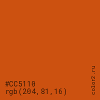 Цвет #CC5110 в цветовой модели RGB обозначается тремя октетами (204, 81, 16) в десятичном формате и #CC5110 в шестнадцатиричном (hex) формате, которые являются интенсивностью красного 204 (hex CC), интенсивность зелёного 81 (hex 51) и интенсивность синего 16 (hex 10).