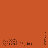 Цвет #CC5628 в цветовой модели RGB обозначается тремя октетами (204, 86, 40) в десятичном формате и #CC5628 в шестнадцатиричном (hex) формате, которые являются интенсивностью красного 204 (hex CC), интенсивность зелёного 86 (hex 56) и интенсивность синего 40 (hex 28).