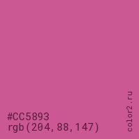 Цвет #CC5893 в цветовой модели RGB обозначается тремя октетами (204, 88, 147) в десятичном формате и #CC5893 в шестнадцатиричном (hex) формате, которые являются интенсивностью красного 204 (hex CC), интенсивность зелёного 88 (hex 58) и интенсивность синего 147 (hex 93).