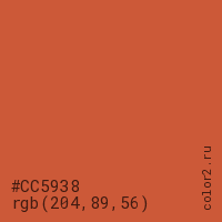 Цвет #CC5938 в цветовой модели RGB обозначается тремя октетами (204, 89, 56) в десятичном формате и #CC5938 в шестнадцатиричном (hex) формате, которые являются интенсивностью красного 204 (hex CC), интенсивность зелёного 89 (hex 59) и интенсивность синего 56 (hex 38).