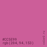 Цвет #CC5E99 в цветовой модели RGB обозначается тремя октетами (204, 94, 153) в десятичном формате и #CC5E99 в шестнадцатиричном (hex) формате, которые являются интенсивностью красного 204 (hex CC), интенсивность зелёного 94 (hex 5E) и интенсивность синего 153 (hex 99).