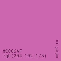 Цвет #CC66AF в цветовой модели RGB обозначается тремя октетами (204, 102, 175) в десятичном формате и #CC66AF в шестнадцатиричном (hex) формате, которые являются интенсивностью красного 204 (hex CC), интенсивность зелёного 102 (hex 66) и интенсивность синего 175 (hex AF).