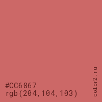 Цвет #CC6867 в цветовой модели RGB обозначается тремя октетами (204, 104, 103) в десятичном формате и #CC6867 в шестнадцатиричном (hex) формате, которые являются интенсивностью красного 204 (hex CC), интенсивность зелёного 104 (hex 68) и интенсивность синего 103 (hex 67).