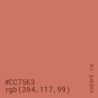Цвет #CC7563 в цветовой модели RGB обозначается тремя октетами (204, 117, 99) в десятичном формате и #CC7563 в шестнадцатиричном (hex) формате, которые являются интенсивностью красного 204 (hex CC), интенсивность зелёного 117 (hex 75) и интенсивность синего 99 (hex 63).