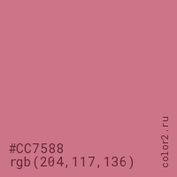 Цвет #CC7588 в цветовой модели RGB обозначается тремя октетами (204, 117, 136) в десятичном формате и #CC7588 в шестнадцатиричном (hex) формате, которые являются интенсивностью красного 204 (hex CC), интенсивность зелёного 117 (hex 75) и интенсивность синего 136 (hex 88).