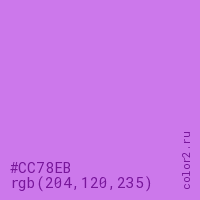 Цвет #CC78EB в цветовой модели RGB обозначается тремя октетами (204, 120, 235) в десятичном формате и #CC78EB в шестнадцатиричном (hex) формате, которые являются интенсивностью красного 204 (hex CC), интенсивность зелёного 120 (hex 78) и интенсивность синего 235 (hex EB).