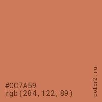 Цвет #CC7A59 в цветовой модели RGB обозначается тремя октетами (204, 122, 89) в десятичном формате и #CC7A59 в шестнадцатиричном (hex) формате, которые являются интенсивностью красного 204 (hex CC), интенсивность зелёного 122 (hex 7A) и интенсивность синего 89 (hex 59).