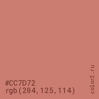 Цвет #CC7D72 в цветовой модели RGB обозначается тремя октетами (204, 125, 114) в десятичном формате и #CC7D72 в шестнадцатиричном (hex) формате, которые являются интенсивностью красного 204 (hex CC), интенсивность зелёного 125 (hex 7D) и интенсивность синего 114 (hex 72).