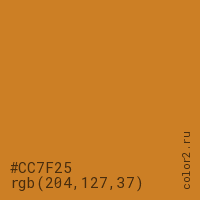 Цвет #CC7F25 в цветовой модели RGB обозначается тремя октетами (204, 127, 37) в десятичном формате и #CC7F25 в шестнадцатиричном (hex) формате, которые являются интенсивностью красного 204 (hex CC), интенсивность зелёного 127 (hex 7F) и интенсивность синего 37 (hex 25).