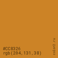 Цвет #CC8326 в цветовой модели RGB обозначается тремя октетами (204, 131, 38) в десятичном формате и #CC8326 в шестнадцатиричном (hex) формате, которые являются интенсивностью красного 204 (hex CC), интенсивность зелёного 131 (hex 83) и интенсивность синего 38 (hex 26).