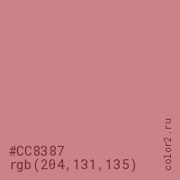 Цвет #CC8387 в цветовой модели RGB обозначается тремя октетами (204, 131, 135) в десятичном формате и #CC8387 в шестнадцатиричном (hex) формате, которые являются интенсивностью красного 204 (hex CC), интенсивность зелёного 131 (hex 83) и интенсивность синего 135 (hex 87).
