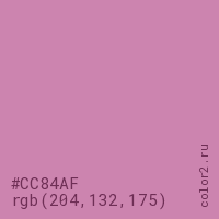Цвет #CC84AF в цветовой модели RGB обозначается тремя октетами (204, 132, 175) в десятичном формате и #CC84AF в шестнадцатиричном (hex) формате, которые являются интенсивностью красного 204 (hex CC), интенсивность зелёного 132 (hex 84) и интенсивность синего 175 (hex AF).