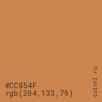 Цвет #CC854F в цветовой модели RGB обозначается тремя октетами (204, 133, 79) в десятичном формате и #CC854F в шестнадцатиричном (hex) формате, которые являются интенсивностью красного 204 (hex CC), интенсивность зелёного 133 (hex 85) и интенсивность синего 79 (hex 4F).