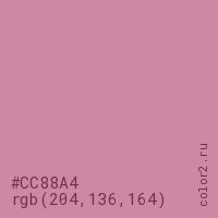 Цвет RGB(204, 136, 164) в процентом отношении количества цвета состоит из 80% красного (red), 53.3% зелёного (green) и 64.3% синего (blue).