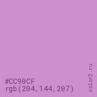 Цвет #CC90CF в цветовой модели RGB обозначается тремя октетами (204, 144, 207) в десятичном формате и #CC90CF в шестнадцатиричном (hex) формате, которые являются интенсивностью красного 204 (hex CC), интенсивность зелёного 144 (hex 90) и интенсивность синего 207 (hex CF).