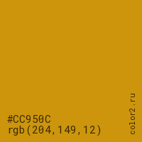 Цвет #CC950C в цветовой модели RGB обозначается тремя октетами (204, 149, 12) в десятичном формате и #CC950C в шестнадцатиричном (hex) формате, которые являются интенсивностью красного 204 (hex CC), интенсивность зелёного 149 (hex 95) и интенсивность синего 12 (hex 0C).