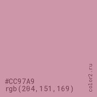 Цвет #CC97A9 в цветовой модели RGB обозначается тремя октетами (204, 151, 169) в десятичном формате и #CC97A9 в шестнадцатиричном (hex) формате, которые являются интенсивностью красного 204 (hex CC), интенсивность зелёного 151 (hex 97) и интенсивность синего 169 (hex A9).