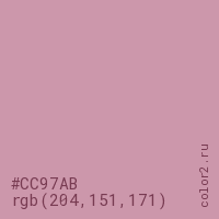 Цвет #CC97AB в цветовой модели RGB обозначается тремя октетами (204, 151, 171) в десятичном формате и #CC97AB в шестнадцатиричном (hex) формате, которые являются интенсивностью красного 204 (hex CC), интенсивность зелёного 151 (hex 97) и интенсивность синего 171 (hex AB).