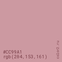 Цвет #CC99A1 в цветовой модели RGB обозначается тремя октетами (204, 153, 161) в десятичном формате и #CC99A1 в шестнадцатиричном (hex) формате, которые являются интенсивностью красного 204 (hex CC), интенсивность зелёного 153 (hex 99) и интенсивность синего 161 (hex A1).