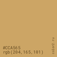 Цвет #CCA565 в цветовой модели RGB обозначается тремя октетами (204, 165, 101) в десятичном формате и #CCA565 в шестнадцатиричном (hex) формате, которые являются интенсивностью красного 204 (hex CC), интенсивность зелёного 165 (hex A5) и интенсивность синего 101 (hex 65).