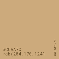 Цвет #CCAA7C в цветовой модели RGB обозначается тремя октетами (204, 170, 124) в десятичном формате и #CCAA7C в шестнадцатиричном (hex) формате, которые являются интенсивностью красного 204 (hex CC), интенсивность зелёного 170 (hex AA) и интенсивность синего 124 (hex 7C).