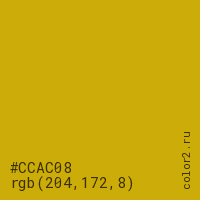 Цвет #CCAC08 в цветовой модели RGB обозначается тремя октетами (204, 172, 8) в десятичном формате и #CCAC08 в шестнадцатиричном (hex) формате, которые являются интенсивностью красного 204 (hex CC), интенсивность зелёного 172 (hex AC) и интенсивность синего 8 (hex 08).