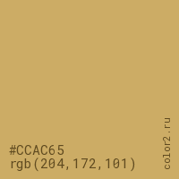 Цвет #CCAC65 в цветовой модели RGB обозначается тремя октетами (204, 172, 101) в десятичном формате и #CCAC65 в шестнадцатиричном (hex) формате, которые являются интенсивностью красного 204 (hex CC), интенсивность зелёного 172 (hex AC) и интенсивность синего 101 (hex 65).