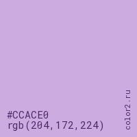Цвет #CCACE0 в цветовой модели RGB обозначается тремя октетами (204, 172, 224) в десятичном формате и #CCACE0 в шестнадцатиричном (hex) формате, которые являются интенсивностью красного 204 (hex CC), интенсивность зелёного 172 (hex AC) и интенсивность синего 224 (hex E0).