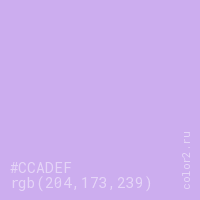 Цвет #CCADEF в цветовой модели RGB обозначается тремя октетами (204, 173, 239) в десятичном формате и #CCADEF в шестнадцатиричном (hex) формате, которые являются интенсивностью красного 204 (hex CC), интенсивность зелёного 173 (hex AD) и интенсивность синего 239 (hex EF).