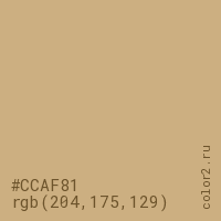 Цвет #CCAF81 в цветовой модели RGB обозначается тремя октетами (204, 175, 129) в десятичном формате и #CCAF81 в шестнадцатиричном (hex) формате, которые являются интенсивностью красного 204 (hex CC), интенсивность зелёного 175 (hex AF) и интенсивность синего 129 (hex 81).
