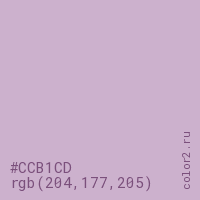 Цвет #CCB1CD в цветовой модели RGB обозначается тремя октетами (204, 177, 205) в десятичном формате и #CCB1CD в шестнадцатиричном (hex) формате, которые являются интенсивностью красного 204 (hex CC), интенсивность зелёного 177 (hex B1) и интенсивность синего 205 (hex CD).